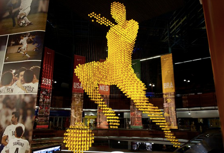 To celebrate the beautiful game of soccer, Nike unveiled the “Ball Man” – a giant 21 meter high soccer player made from 5,500 skills balls and weighing more than 4.5 tons suspended from the atrium of the landmark Carlton Centre in Johannesburg, South Africa.